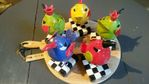 Kleurrijke vogeltjes gemaakt van paperclay. Geglazuurd en gebakken op 1040 graden, op zuiltjes